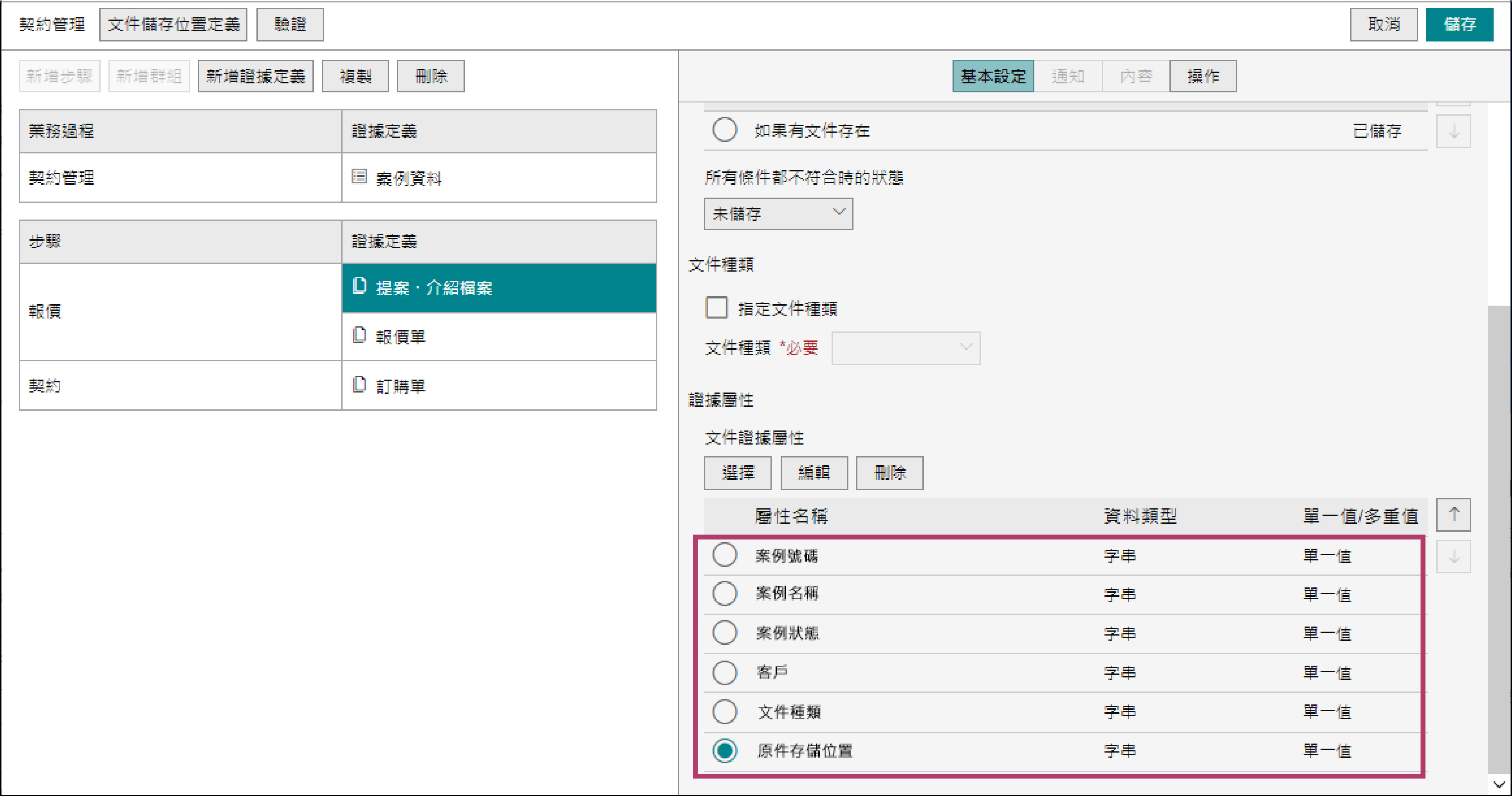 重複步驟5~10,將以下屬性新增至[文件證據屬性的輸入設定]總覽中。