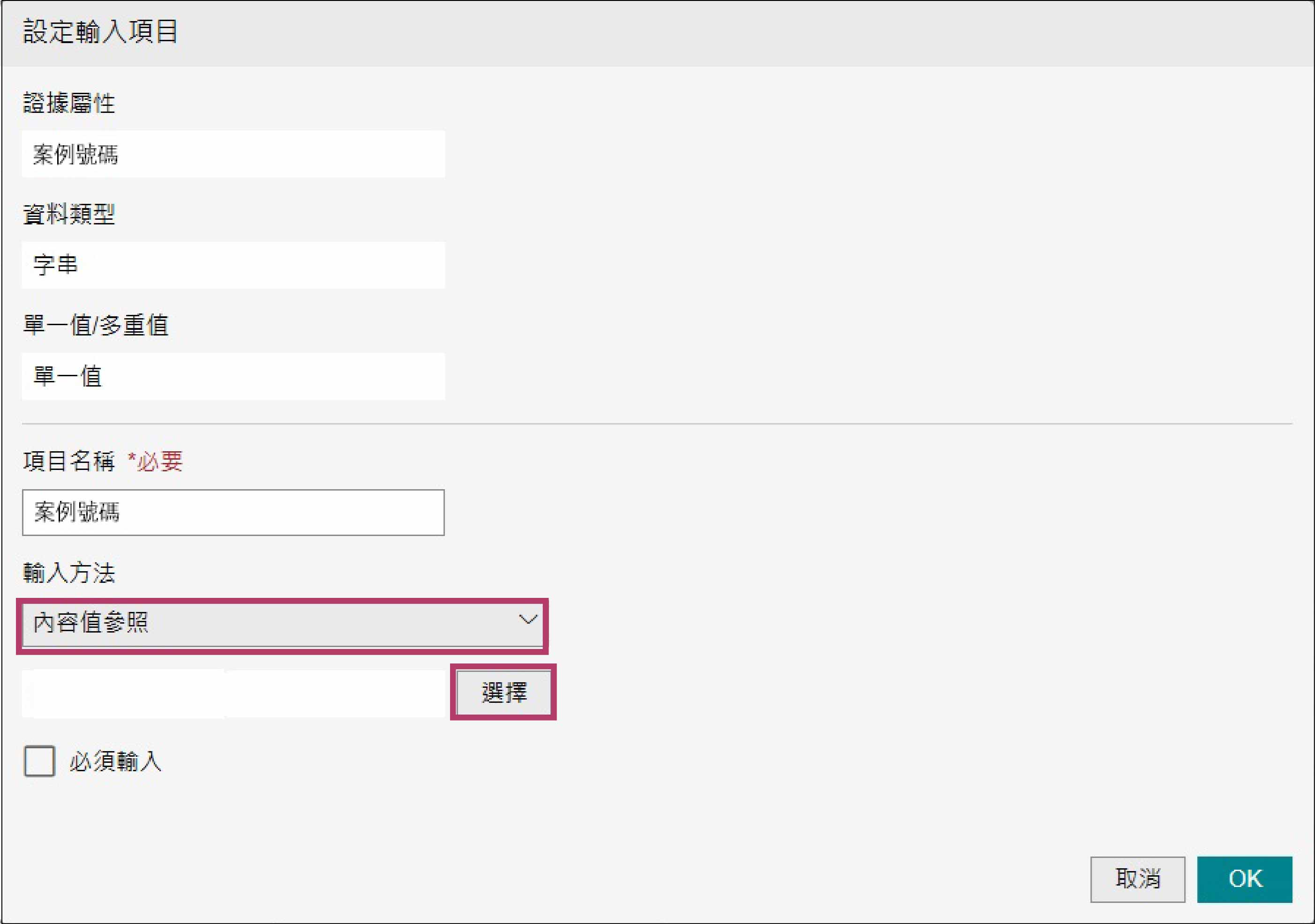 [輸入方法]設定為[內容值參照],點選[選擇]。