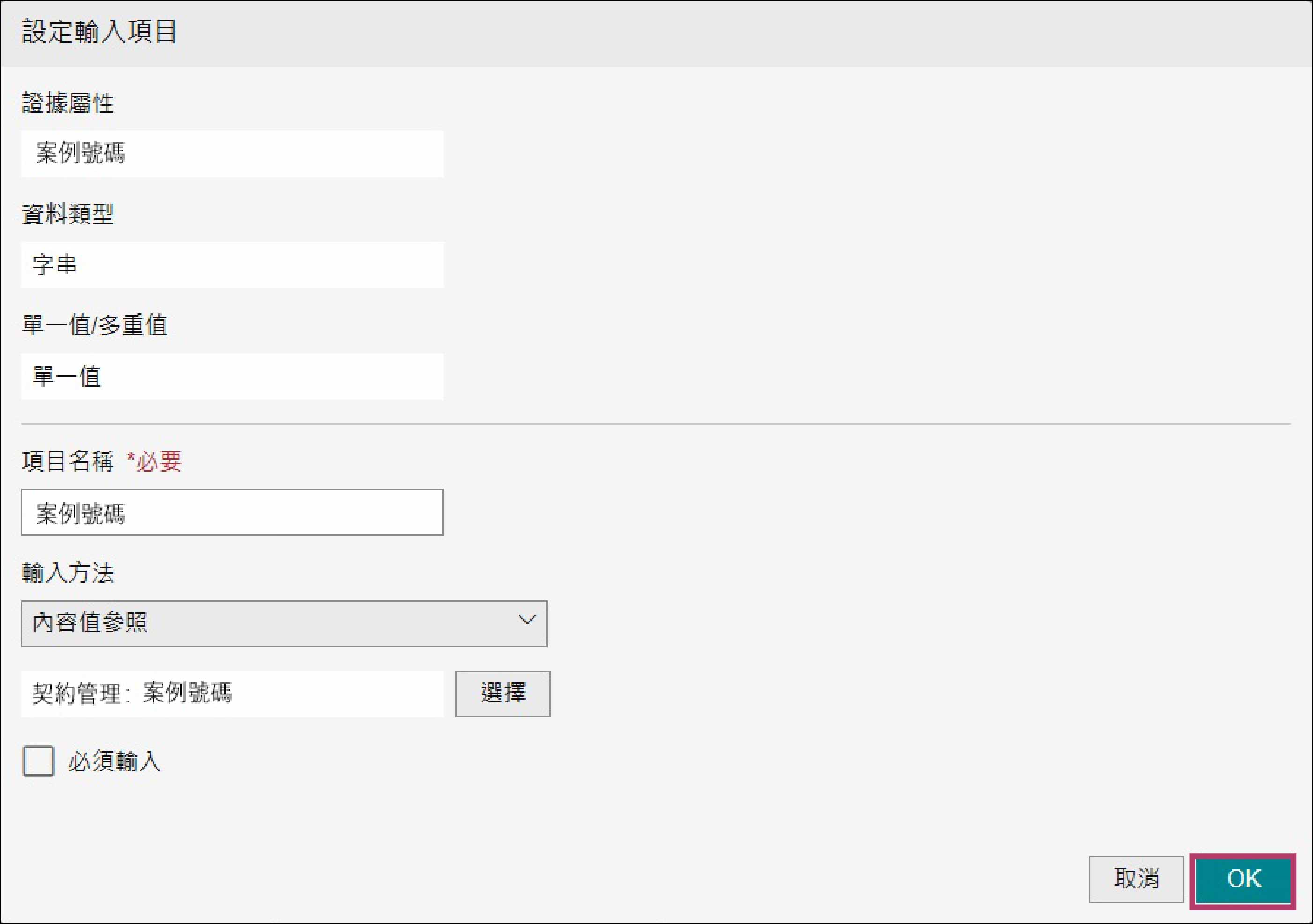 | 案例名稱 | 案例名稱 | 內容值參照、契約管理:案例名稱 | 任意(* 1) |