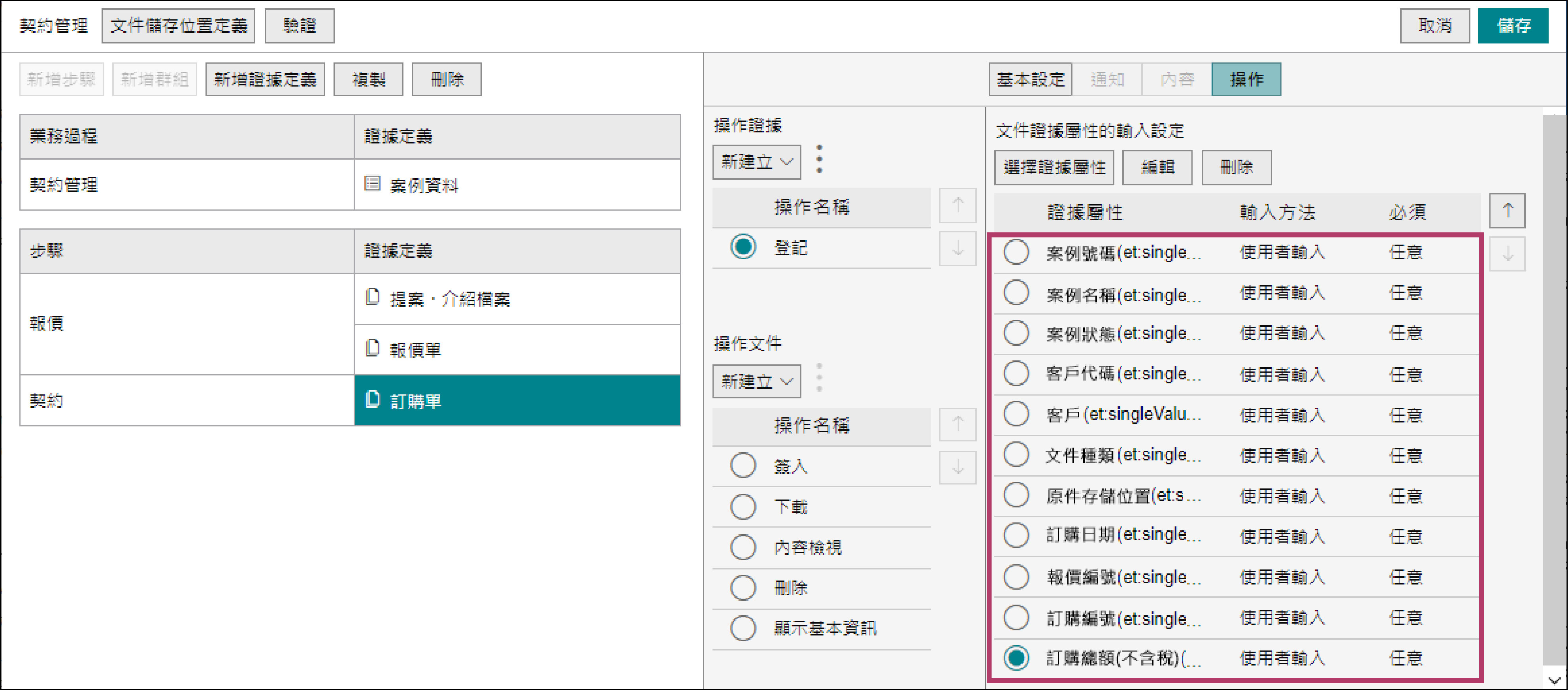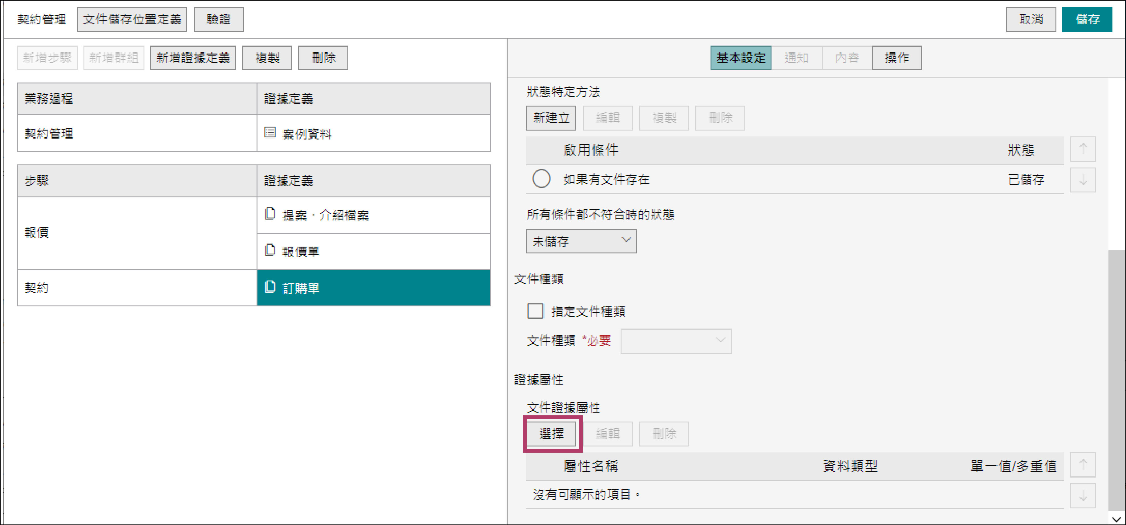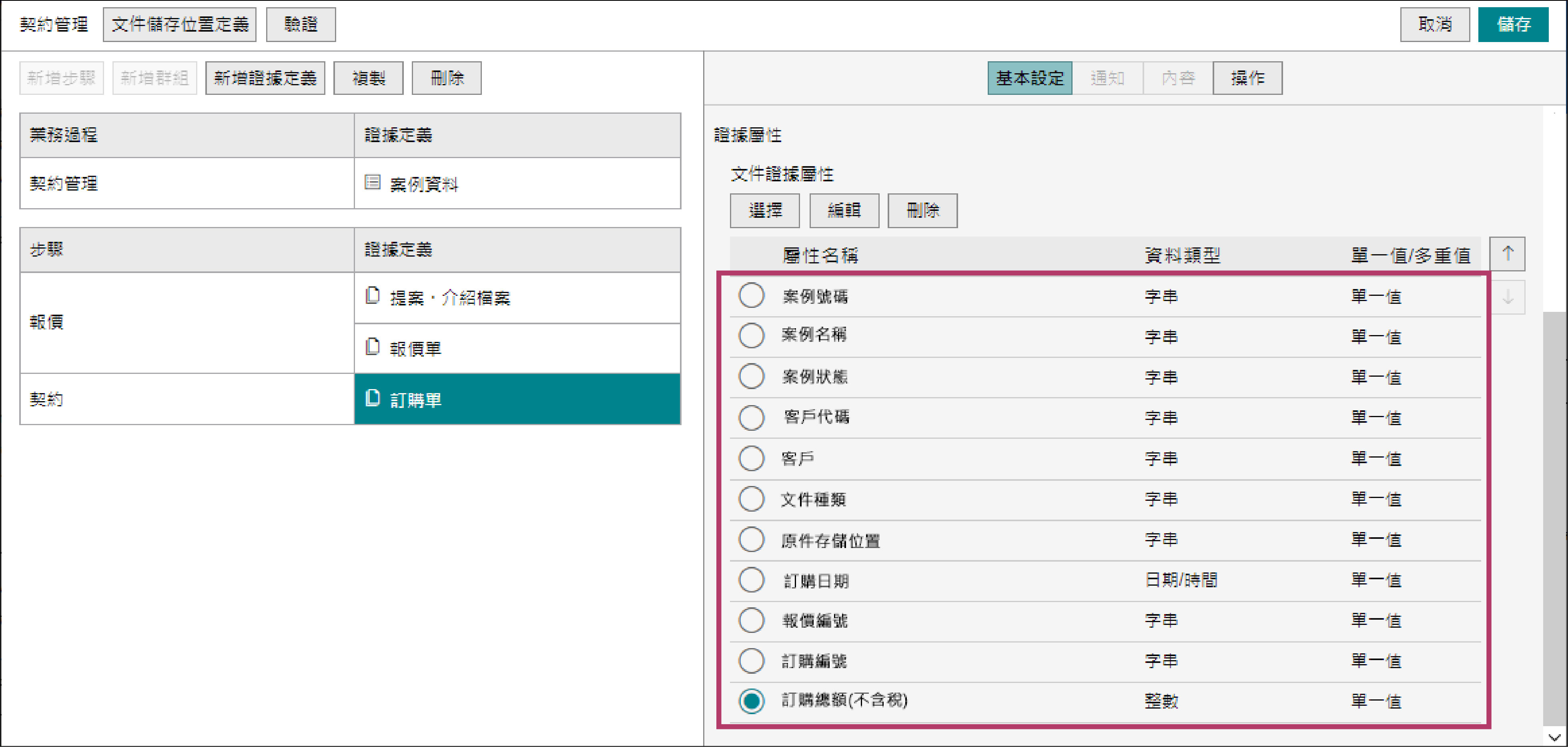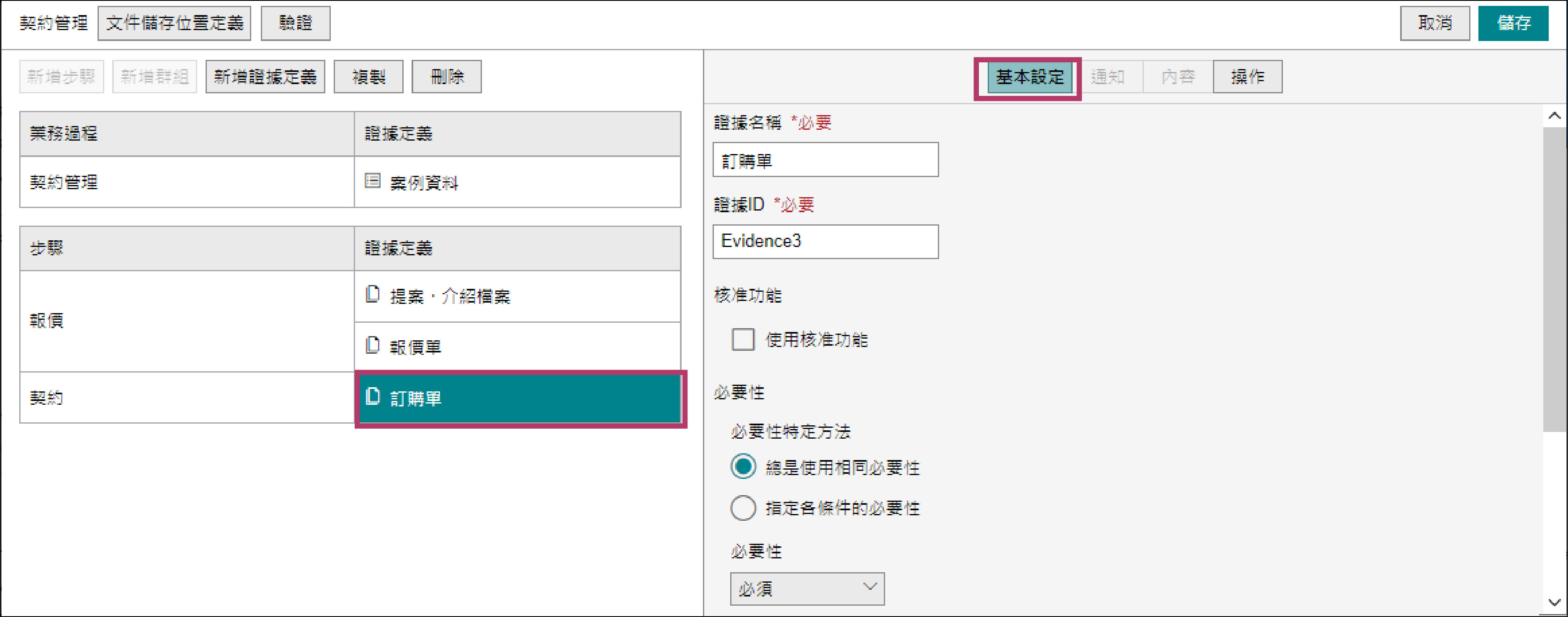 在「契約管理」業務定義的結構編輯器畫面上選擇[證據定義]的[訂購單],點選[基本設定]標籤。