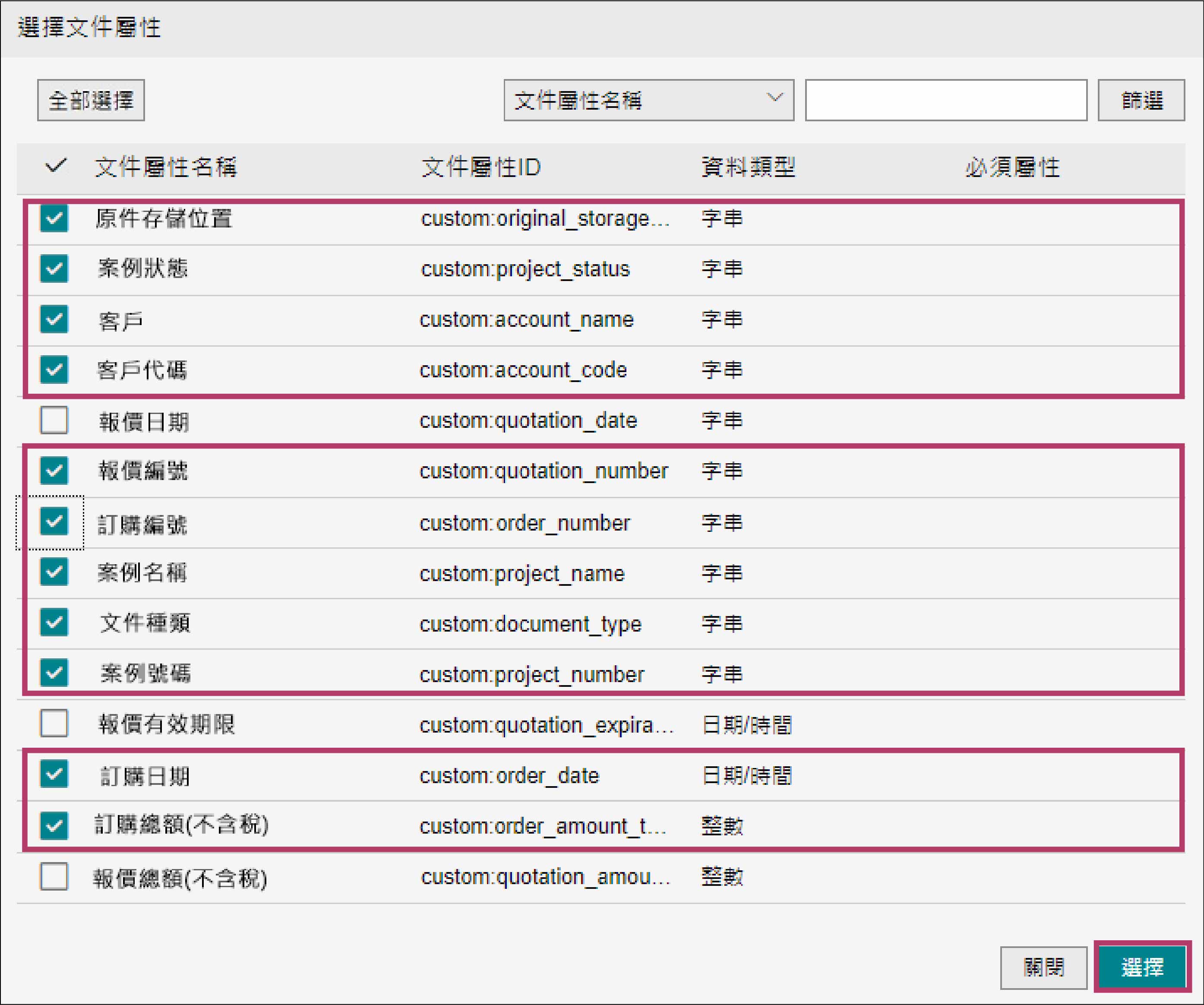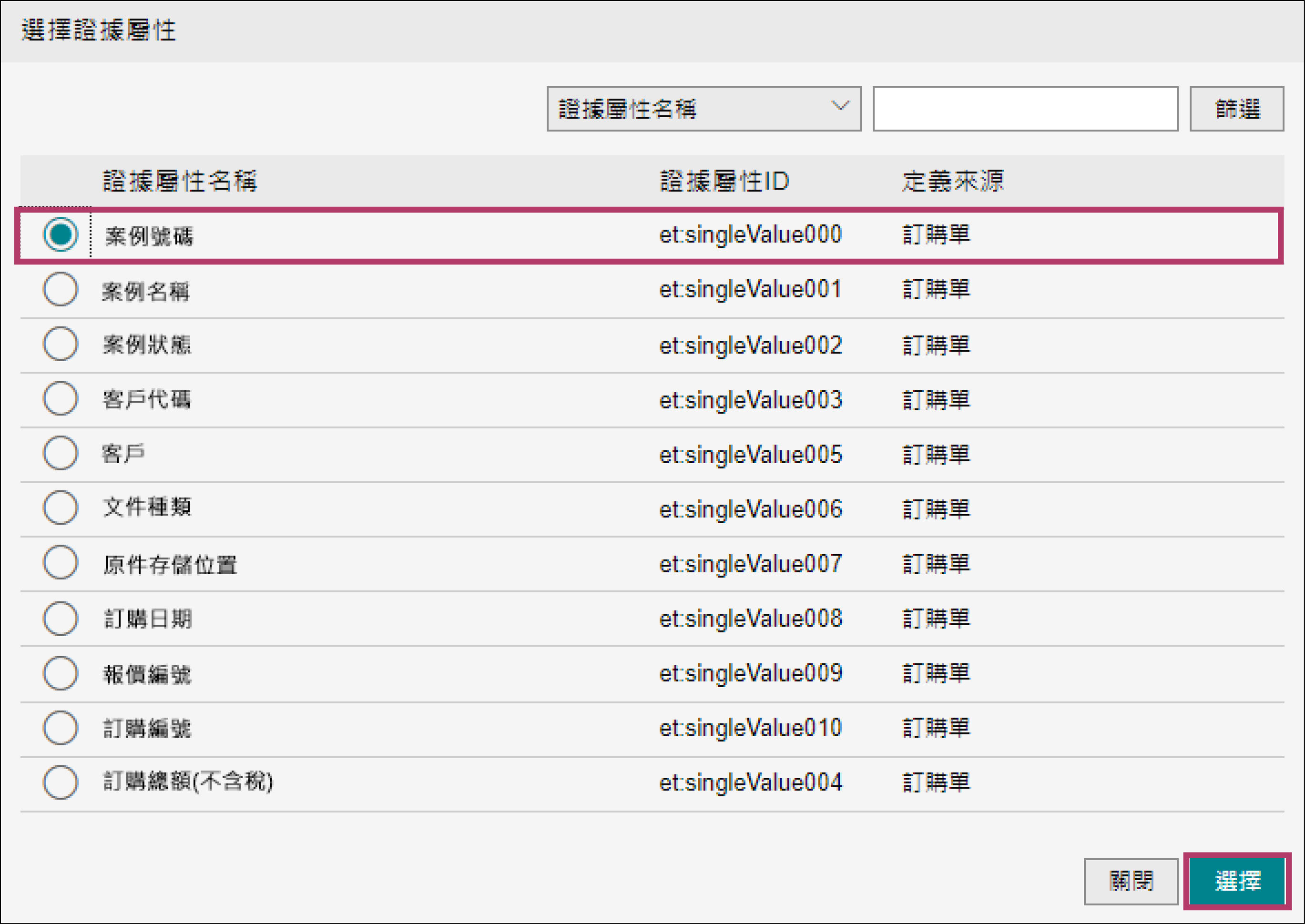 所選擇的屬性被新增至[文件證據屬性]總覽。