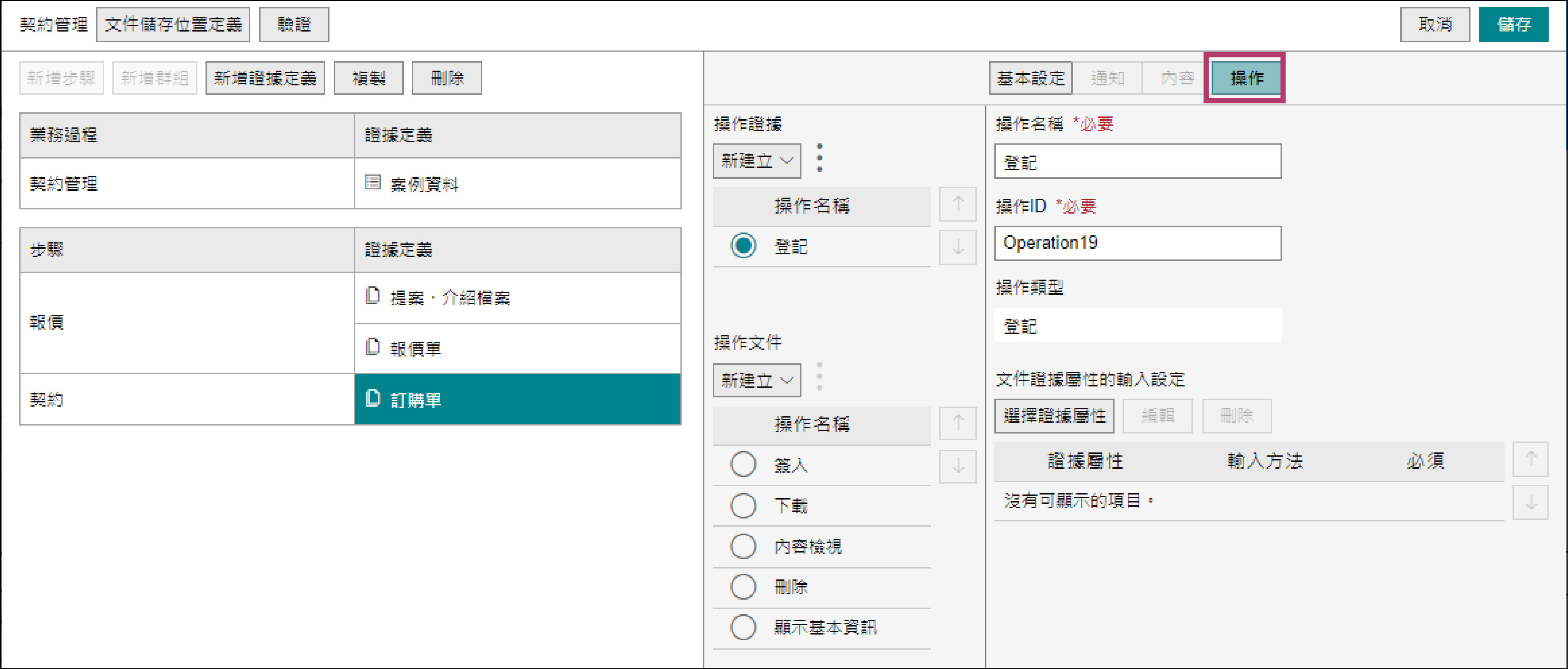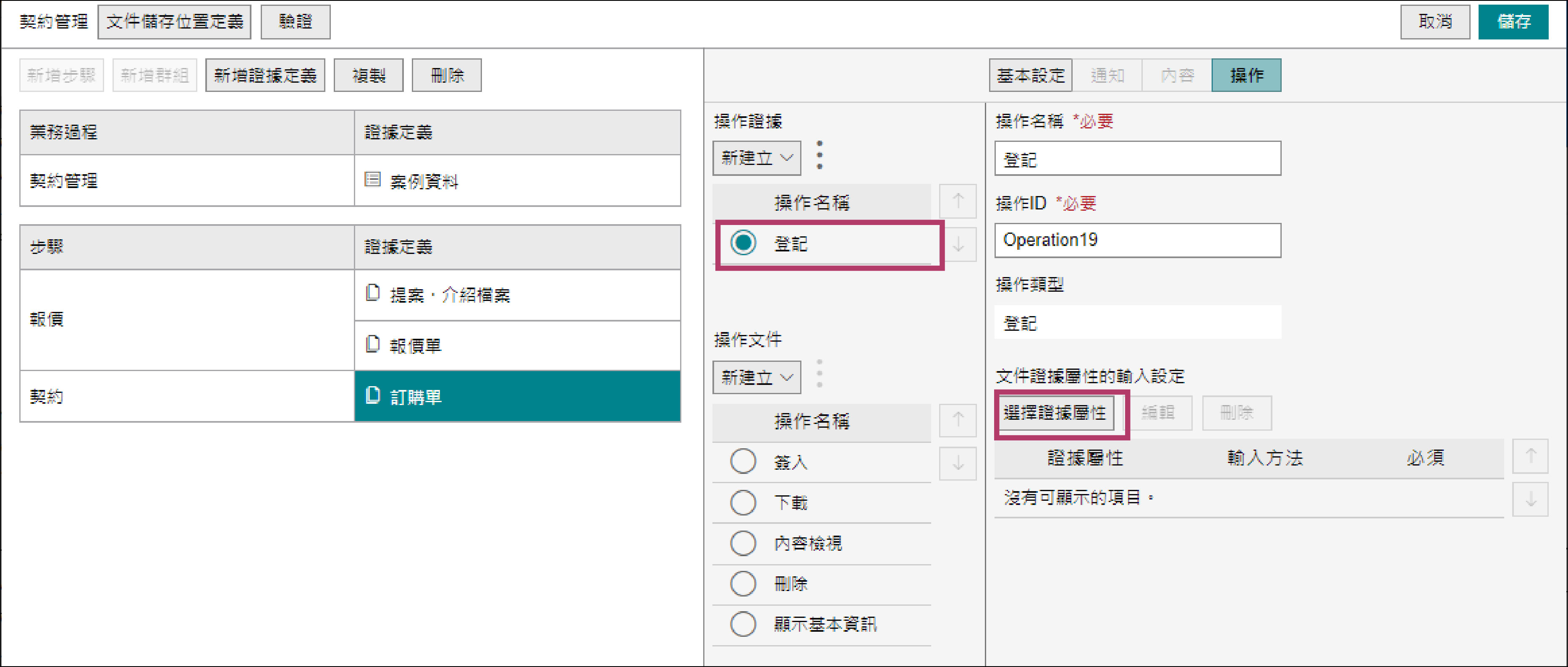選擇[操作證據]的[登記],點選[文件證據屬性的輸入設定]的[選擇證據屬性]。