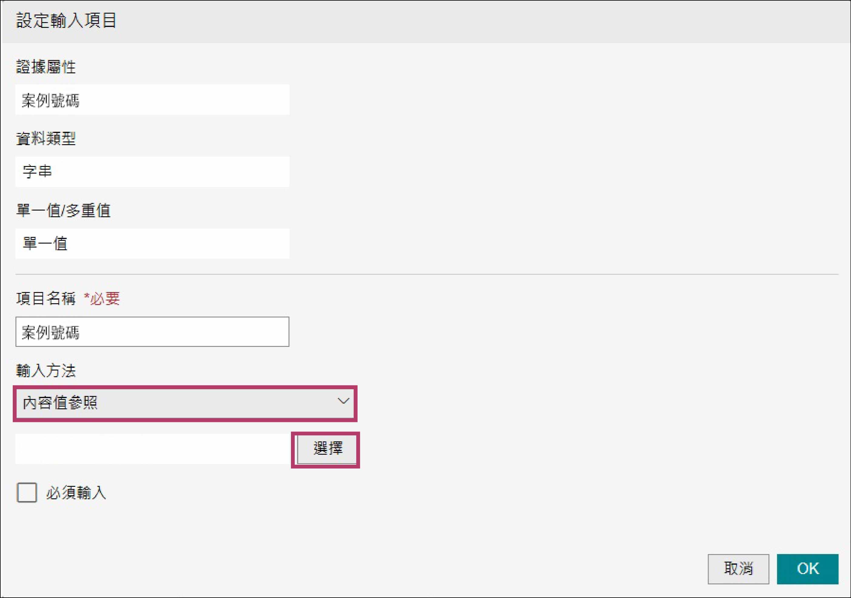 [輸入方法]中選擇[內容值參照],點選[選擇]。