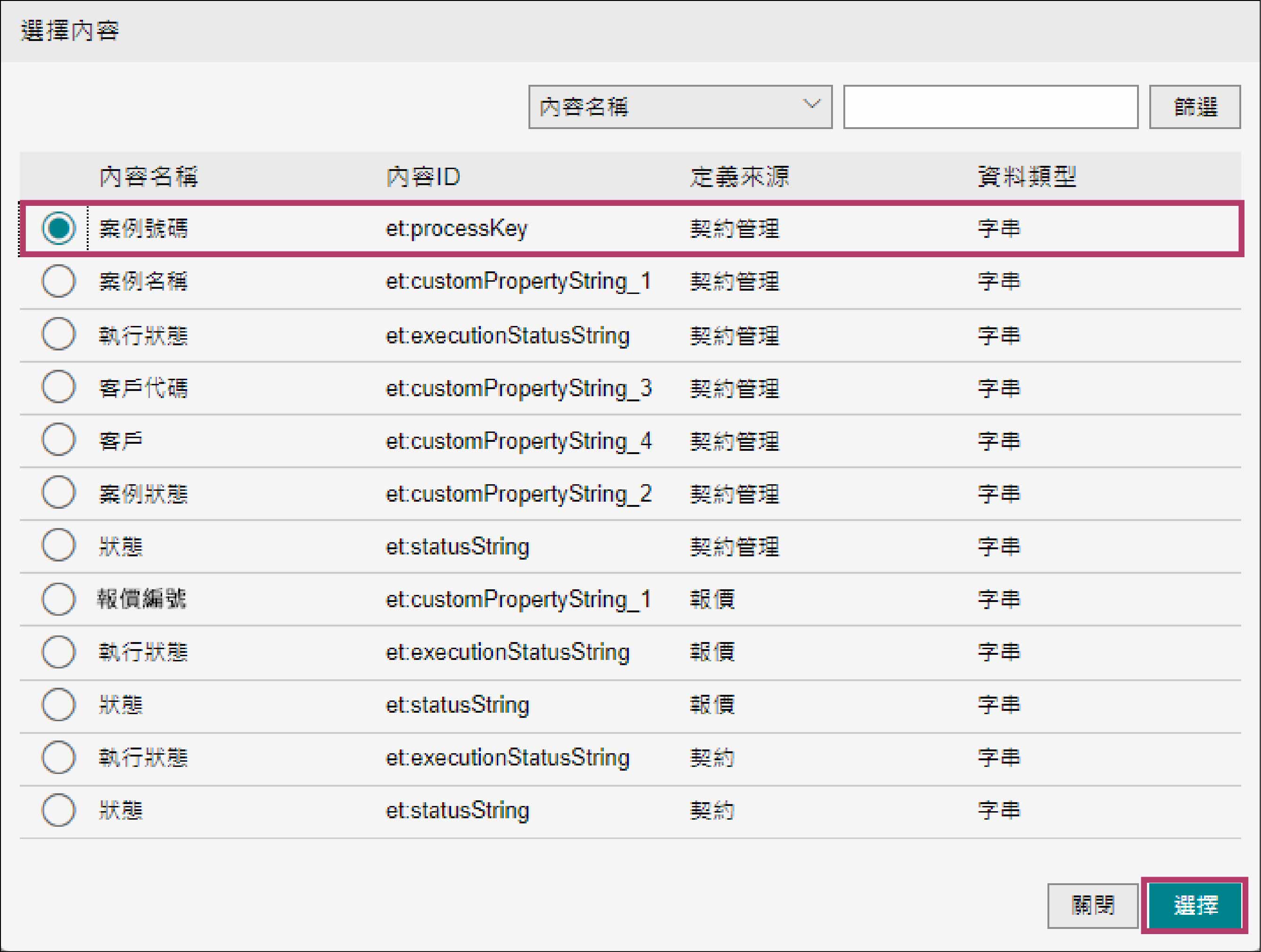 | 案例名稱 | 案例名稱 | 內容值參照、契約管理:案例名稱 | 任意(* 1) |