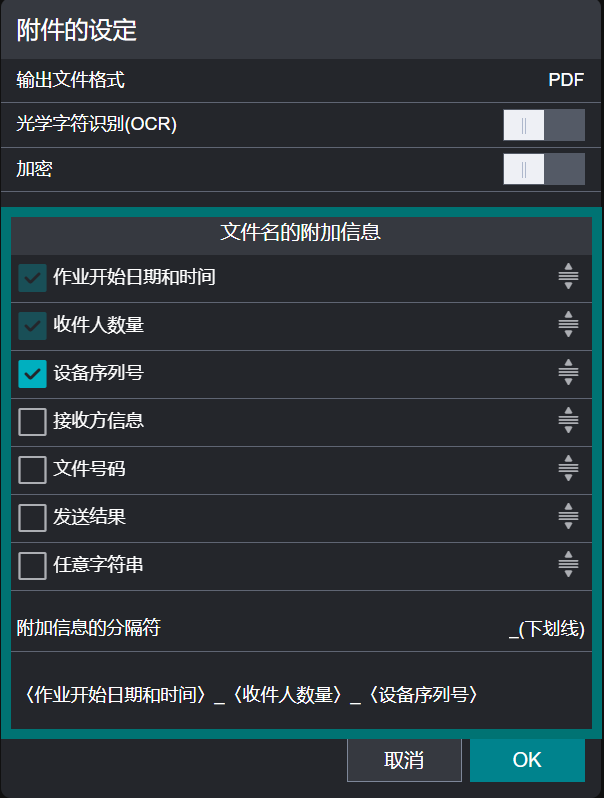 | 上下箭头键 | ●附加信息 调换附加信息的顺序。 ●“附加信息的分隔符”获取焦点时 显示分隔符的菜单。按上下箭头键选择分隔符,并按[Enter]键。 |