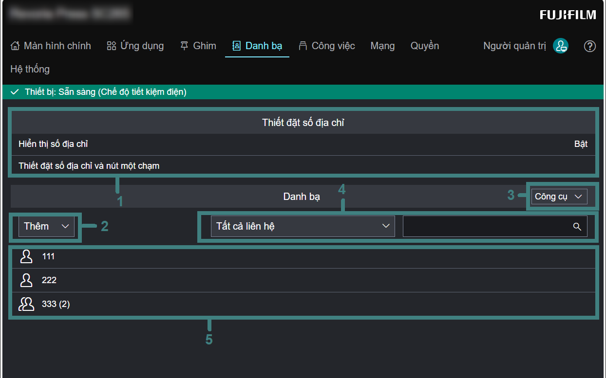 Có thể lọc/tìm kiếm danh sách địa chỉ liên hệ và nhóm đã đăng ký vào danh bạ. Nếu chọn các hạng mục tư menu xổ xuống, sau đó nhập chuỗi văn bản muốn tìm kiếm vào mục tìm kiếm, khi này địa chỉ liên hệ và nhóm thỏa mãn điều kiện thì sẽ được hiển thị.