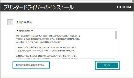 - [使用許諾契約の条項に同意する]にチェックマークを付け、[次へ]をクリックします。