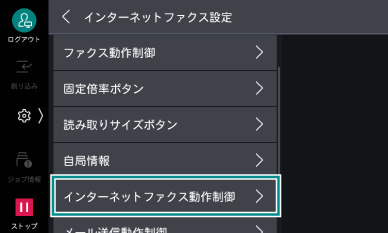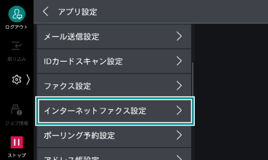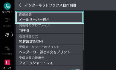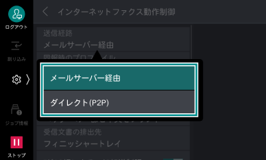 8. インターネットファクスの場合は[メールサーバー経由]をタップ、インターネットファクスダイレクトの場合は、[ダイレクト(P2P)]をタップします。