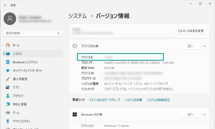 - [デバイス名]に表示されるコンピューター名を確認します。