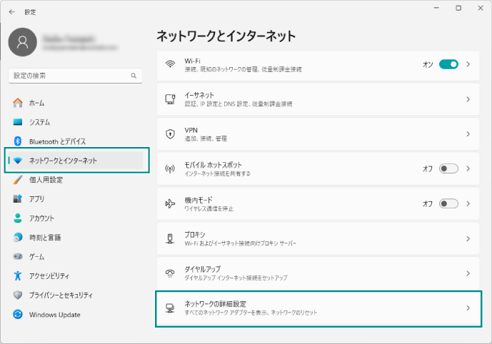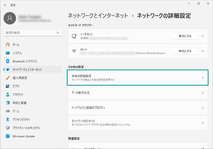 - [ネットワークとインターネット]>[ネットワークの詳細設定]を順にクリックします。