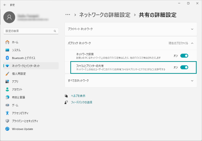 - [ファイルとプリンターの共有]を[オン]に設定します。