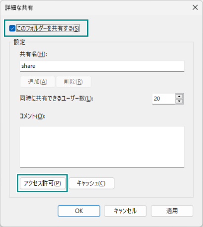 - [このフォルダーを共有する]にチェックマークを付け、[アクセス許可]をクリックします。