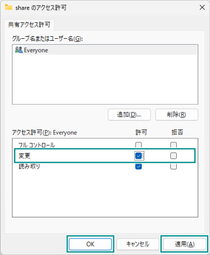 - [アクセス許可:Everyone]欄の[変更]の[許可]にチェックマークを付け、[適用]をクリックします。続けて[OK]をクリックします。