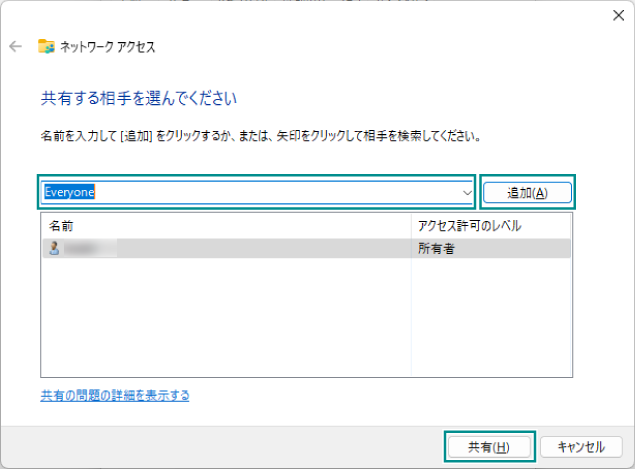 - ドロップダウンリストから[Everyone]を選択し、[追加]をクリックします。続けて[共有]をクリックします。