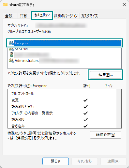 - [セキュリティ]タブを開き、[グループ名またはユーザー名]欄から[Everyone]を選択し、[編集]をクリックします。