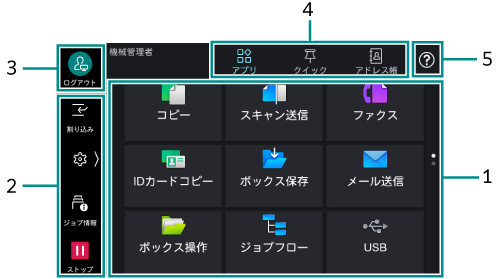 機械管理者、または認証ユーザーとしてログインしている場合は、表示するアプリや配置を変更できます。詳しくは、ホーム画面のカスタマイズを参照してください。