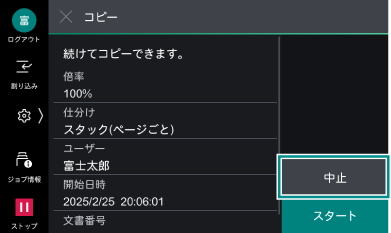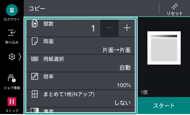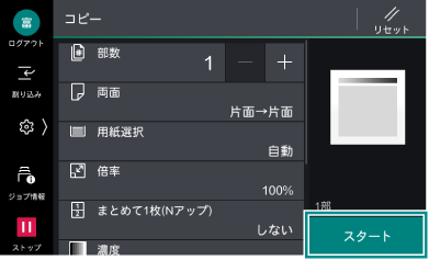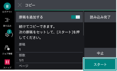 ([リセット])をタップします。排出先を指定する場合は、[排出先/オフセット排出]でトレイ名をタップし、排出トレイを選択します。