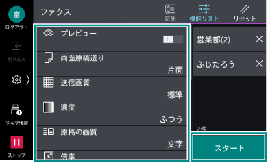4. 必要に応じて、画面上部の ([機能リスト])をタップしてそのほかの項目を設定し、[スタート]をタップします。