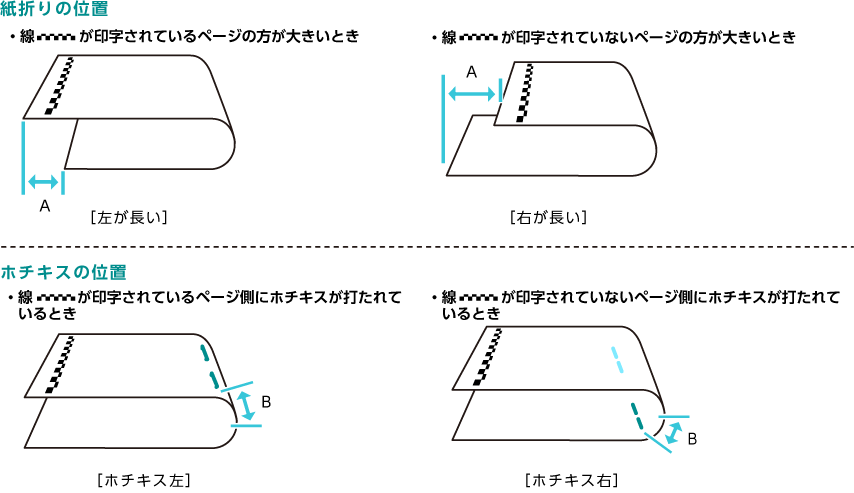 - プリントされたサンプルの紙折り位置とホチキス位置を確認します。