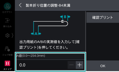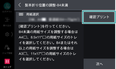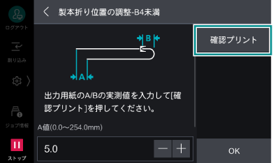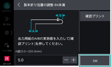 - プリントされたサンプルの紙折り位置とホチキス位置を確認し、問題がなければ[OK]をタップします。