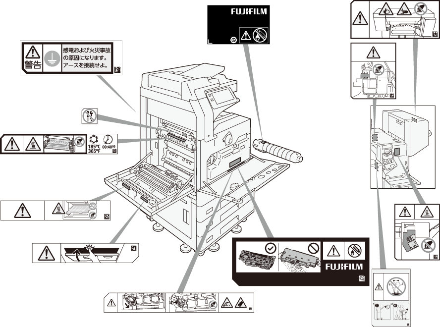 本機の使用環境は次のとおりです。 温度:10~32℃ 湿度:15~85% ただし冷えきった部屋を暖房器具などで急激に暖めると、本機内部に水滴が付着し部分的に印字、または画像読み取りができないことがあります。 |