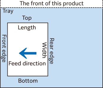 The width, length, front edge, rear edge, top edge, and bottom edge of paper indicate the following positions. For the High Capacity Feeder and Paper Tray 5 (Bypass), the feeding direction is opposite.