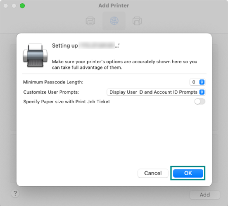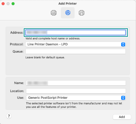 Add the machine to the list of printers. The following steps describe how to install the printer by selecting the IP address on the screen where you can specify a connection protocol.