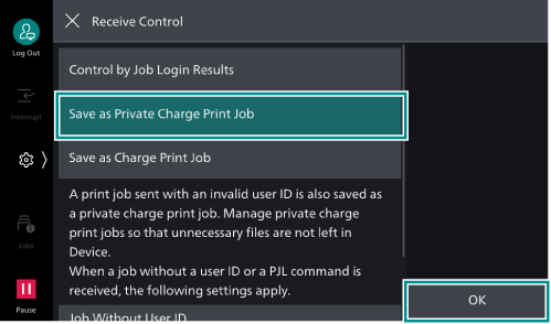 - Select [Save as Private Charge Print Job] and then tap on [OK].