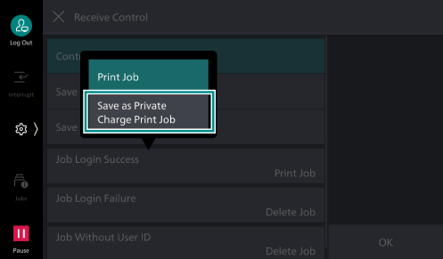 - Tap on [Job Login Success], and then tap on [Save as Private Charge Print Job] of the displayed menu.