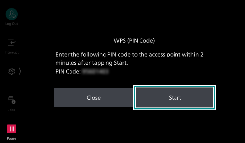 - Tap on [Start] and then enter the displayed PIN code at the wireless LAN access point within 2 minutes.