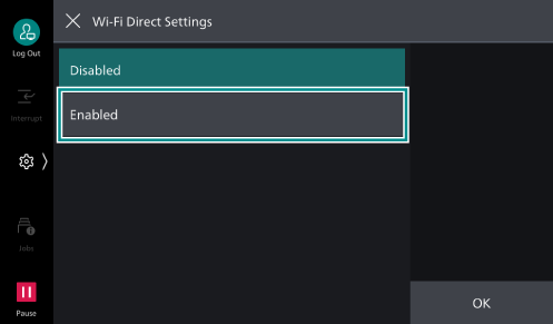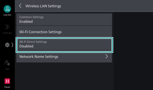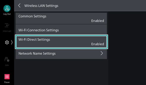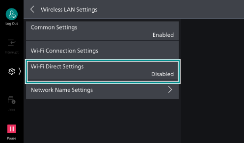 Enter the name of the machine identified by the Wi-Fi Direct network using alphanumerics up to 32 characters. The name set here will be displayed when selecting the machine to connect to from a mobile device.
