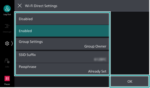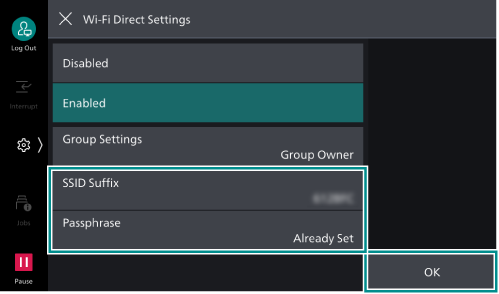 Enter at least 8 and up to 63 alphanumeric characters as the passphrase. When connecting to the Wi-Fi Direct network from a mobile device, enter the passphrase displayed here.