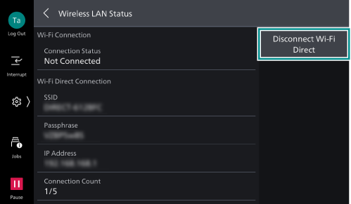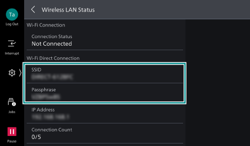 - Confirm [SSID] and [Passphrase] of [Wi-Fi Direct Connection].