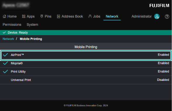 AirPrint is a printing service provided by Apple Inc. By using AirPrint, you can submit documents from devices with iOS such as iPad and iPhone or any macOS computers to print on the machine, without installing any printer drivers or special software.
