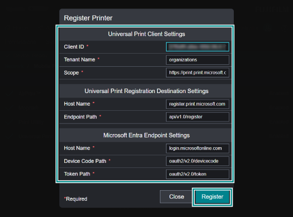 - Enter the account information of the printer administrator or global administrator of Microsoft Entra ID to be the Universal Print registration destination for the machine.