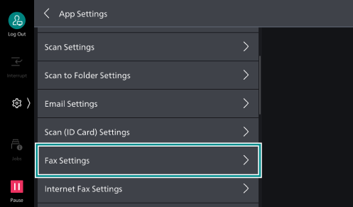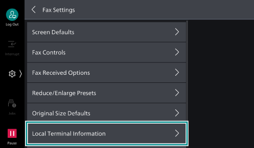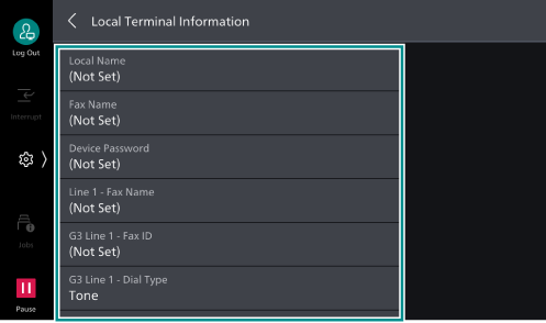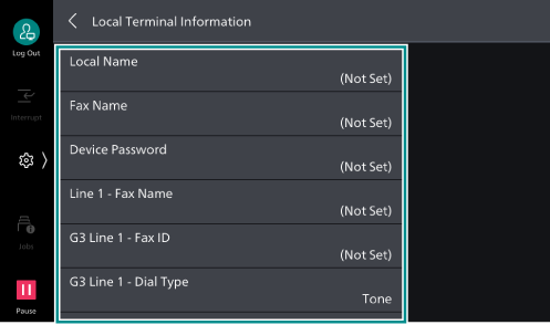 Sets name of fax. The fax name is the name of the local terminal where items like transmission header and cover page are printed.