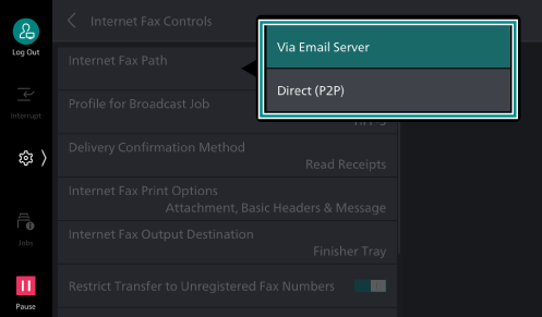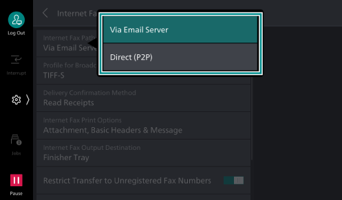 - Tap on [Via Email Server] for Internet Fax, or tap on [Direct (P2P)] for Internet Fax Direct.
