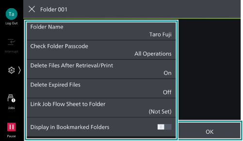 If it is set enabled it is displayed in [Bookmarked Folders] on the [Send from Folder] screen. Up to 10 folders can be set.