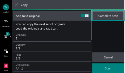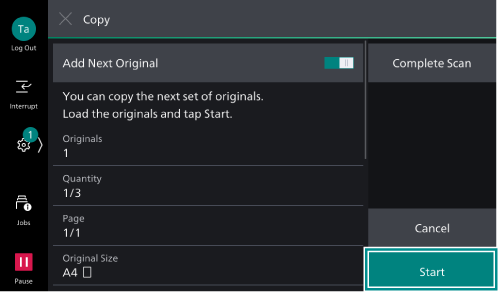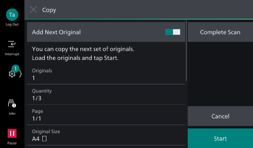 The following confirmation screen appears when [Next Original] is enabled on the feature list.