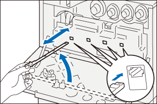 Insert the cleaning bar while facing the arrow mark (↑) up into the four slots of Waste Toner Container. For each slot, insert the bar until it stops, and then slowly slide it back out. Clean each LED printhead by repeating the back and forth action two to three times.