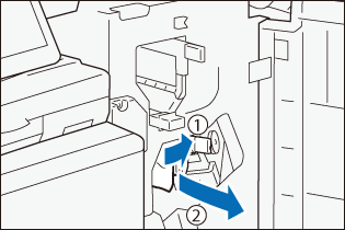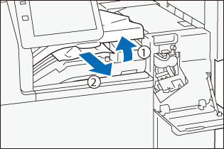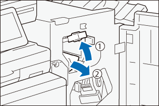 - Hold the handle and open the finisher transport cover.