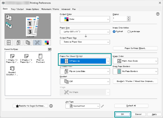 - Select [4 Pages Up] among [Pages Per Sheet (N-Up)] and click [OK].
