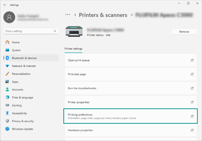 - Under [start] > [Settings] > [Bluetooth & devices] > [Printers & scanners], click the machine.