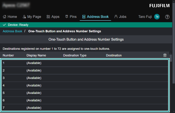 > [Device] > [App Settings] > [Address Book Settings] > [Display Address Number] is set to [On] in Administrator Mode, the registration numbers of 1-72, that are assigned to the recipients in the Address Book, are automatically tied to the numbers on one-touch buttons. In this case, you do not need to do the assignment.