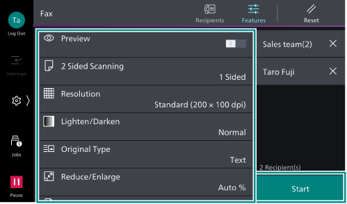 ([Features]) on the upper side of the screen to set other items, and tap on [Start].