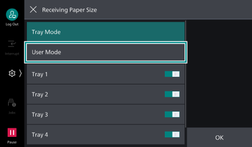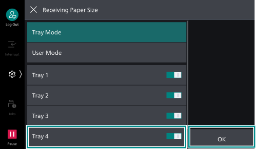- Select [Tray Mode] to enable [Tray 4], and tap on [OK].
