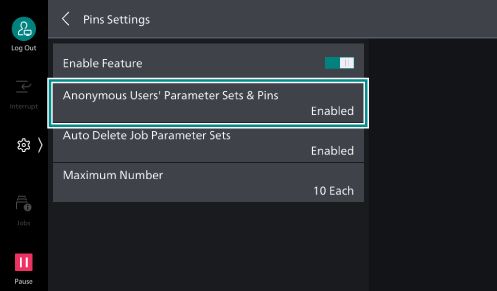 > [Device] > [System Settings] > [Pins Settings] > [Anonymous Users' Parameter Sets & Pins] is disabled