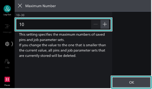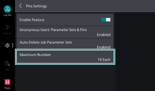 If the maximum number of job entries allowed to be saved in [Pins] is reached, the oldest entries are overwritten first. Pinned jobs are not overwritten.
