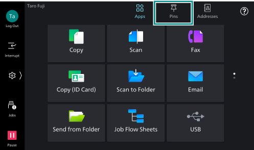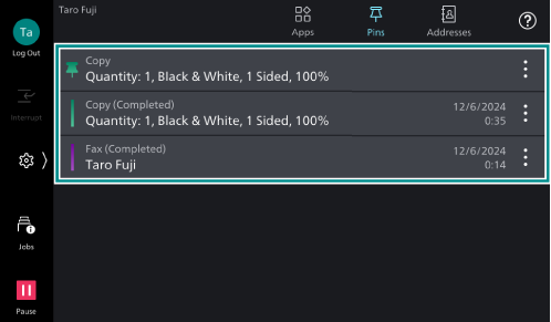 The job history of copy, scan, fax, and Internet fax is displayed in [Pins] for each user. You can select a job to execute again from the list, as well as name and save a frequently used job as a Pin, which can be placed as a shortcut button on the Home screen.
