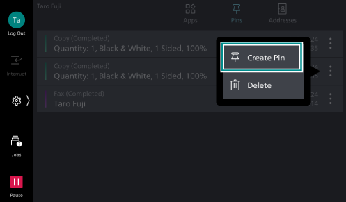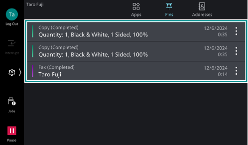 Pins is a feature for making the machine remember job submission history of Copy, Scan, Fax and Internet Fax by user, allowing users to select a job submission history record from the list of records to resubmit it. Selecting a history record displays the app screen where you can start the job.